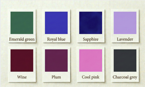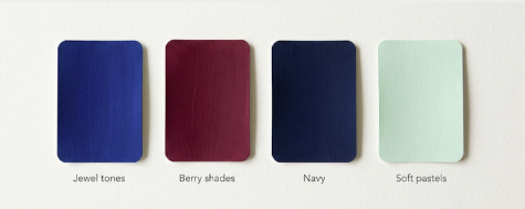 Try jewel tones, berry shades, navy, and soft pastels.